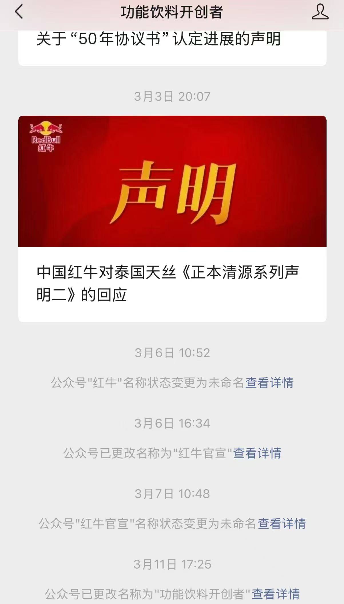 2025年3月,部分饮料行业人士观察到一个微妙变化——华彬集团全资控股的”北京红牛饮料销售有限公司"旗下微信公众号"红牛",在30天内接连更名为“”(无名状态)"红牛官宣"“”(无名状态)及"功能饮料开创者"。这一突然弃用“红牛”字样的举动引发诸多猜测:华彬方面究竟是主动放弃使用红牛商标,还是被迫改名?