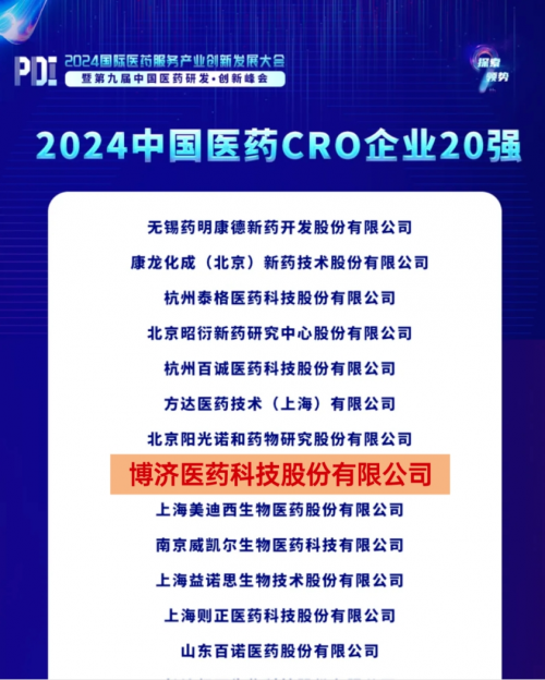 博济医药荣膺2024中国医药CRO企业20强