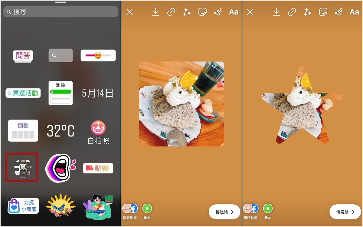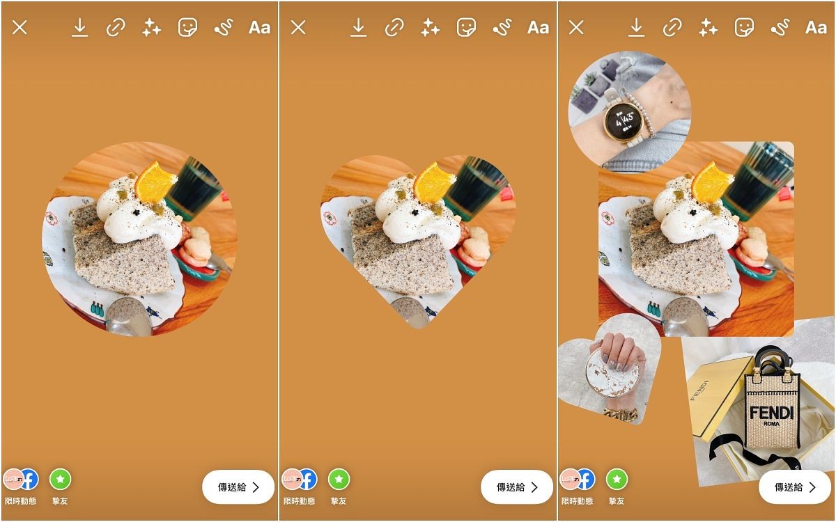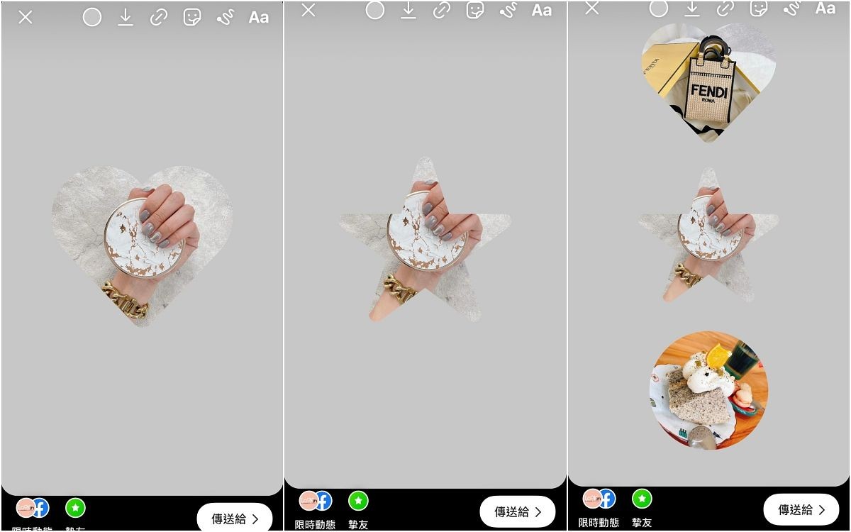 近期新增的裁切照片功能目前能够使用的帐户还不多,只要点一下要分享的照片,就可以将照片直接裁剪成星形、爱心、方块、圆形等等,并且一次可以使用多张图片来裁剪,非常方便。