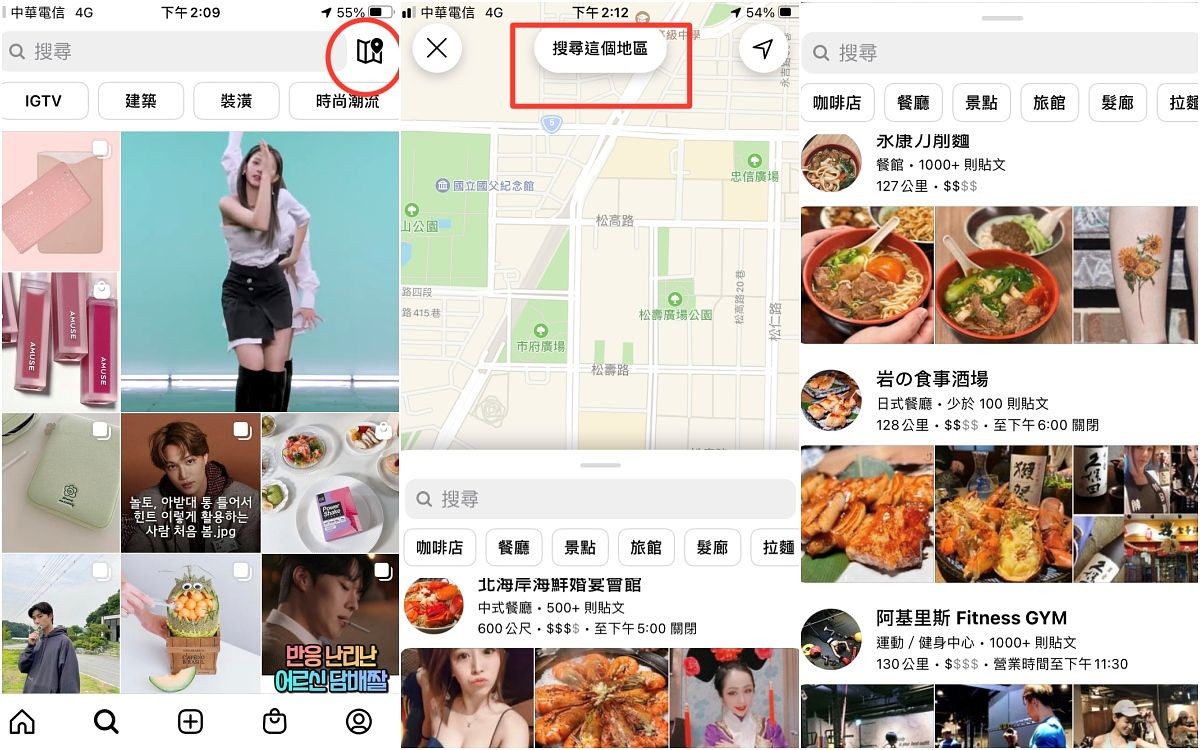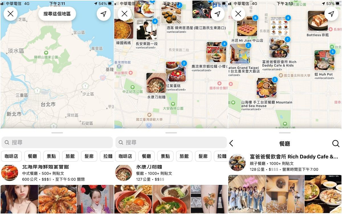 最新推出的地图功能现在为部分帐户开放使用,从搜寻页面点选右上角地图,就能找到附近的餐厅、景点甚至是发廊,点进去之后就能看到关于店家的公开贴文,非常方便。