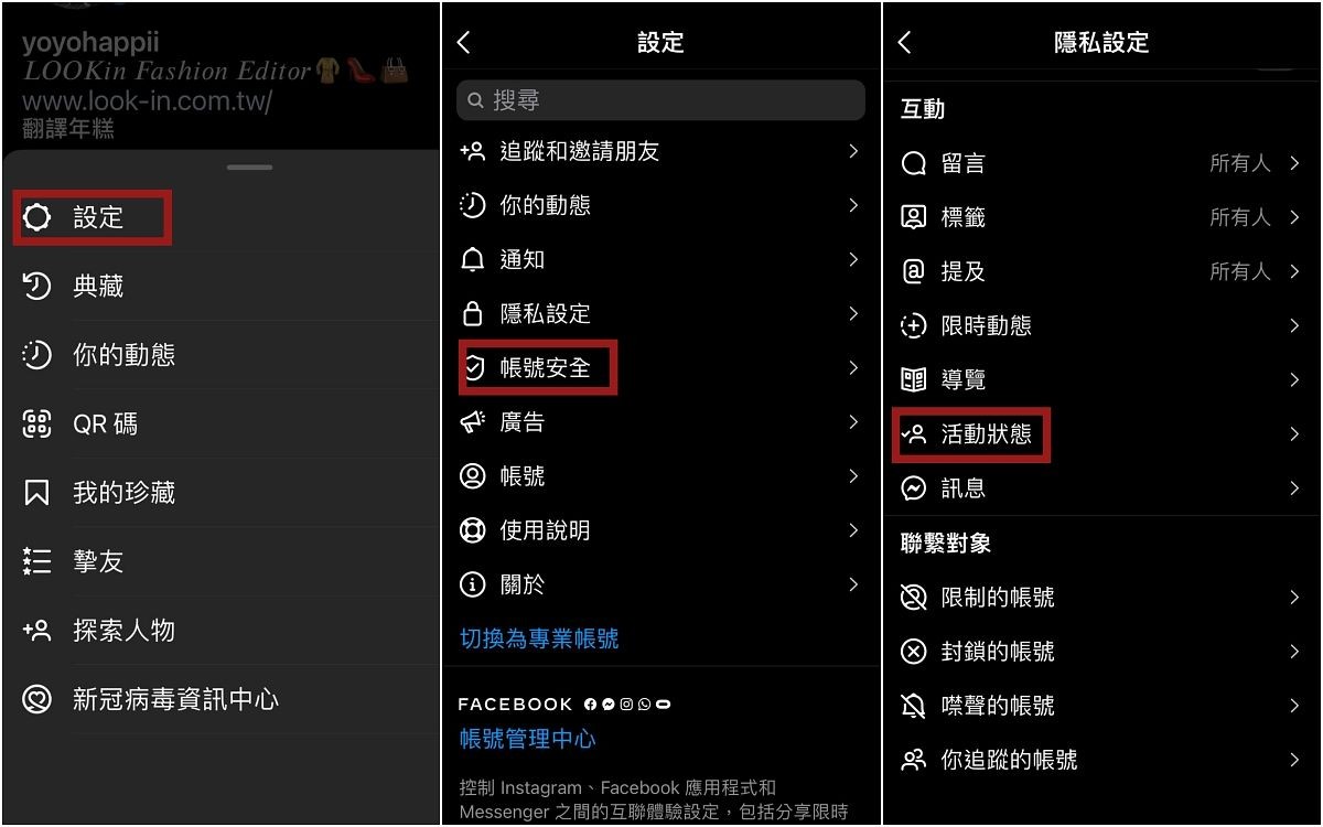 不想被朋友知道、或者是不想续聊、却又怕被人看到上线时间显得尴尬,只要点选个人档案右上角的三杠符号,再依序到设定、帐号安全、活动状态关闭就可以了。