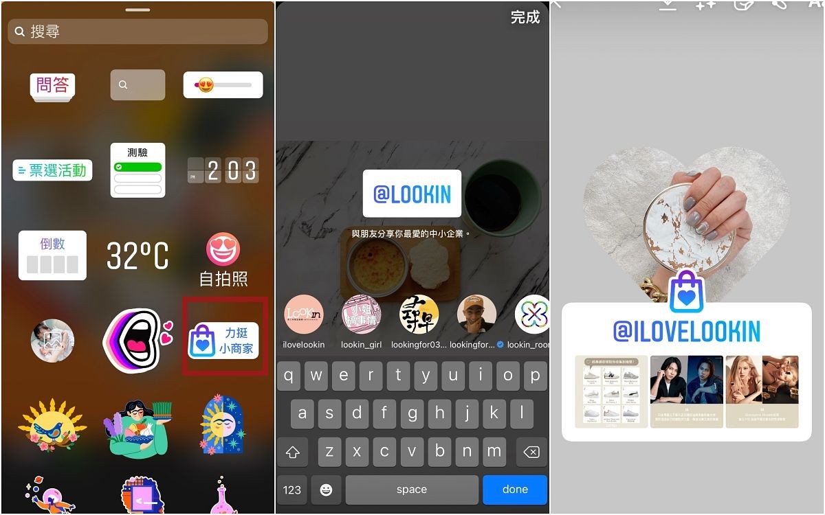 最后是近期新推出的力挺小商家功能,选择立体小商家符号、TAG想要推荐的店家,就会出现购物袋小标示、并且同时页面上会显示店家最新的三则PO文照片,点图能直接连结去店家页面,比起文字TAG更吸引人。