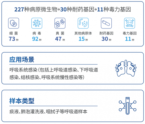 华大基因PTseqTM呼吸道感染病原微生物靶向高通量基因检测依托国产自主测序平台、专利引物设计系统及独有污染矫正算法,具备了测序技术的广谱性和多重PCR技术的高灵敏度优势,覆盖了268种呼吸系统感染核心病原体,并同时进行重点耐药基因和毒力基因鉴定。