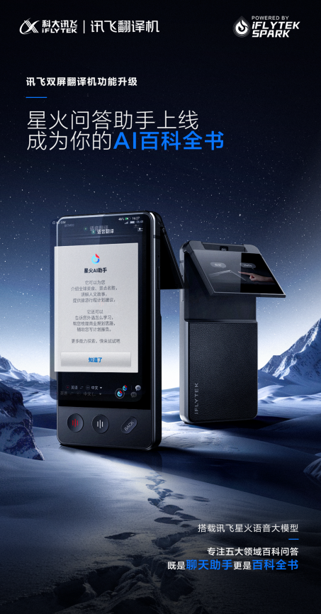 把祝福化作助力并不是口头支票,这需要强大的产品力和专业实力支撑。讯飞翻译机在本次营销活动中迎来了全新升级,新功能用事实给出了自己的答案。作为业内首款搭载讯飞语音大模型的翻译机,讯飞双屏翻译机本次重磅升级了星火问答助手功能,专注于5大领域百科问答,是你的聊天助手更是一部涉猎广泛的AI百科全书。