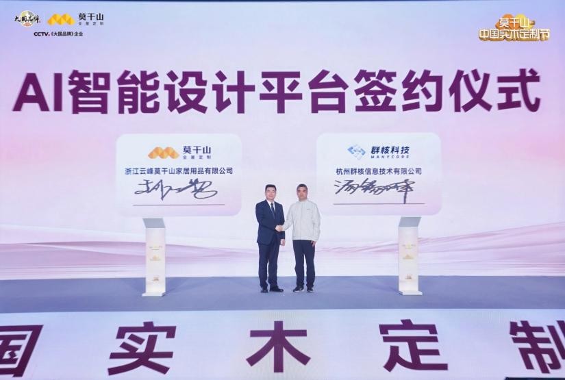 随后,莫干山全屋定制与群核科技(酷家乐)战略签约仪式隆重举行,莫干山大家居总经理刘元秀与群核科技副总裁汤锡峰共同签署协议,标志着莫干山在设计服务端的数智化转型迈出关键一步。与酷家乐的战略携手,是莫干山以科技赋能‘好房子’的重要布局。未来莫干山将以AI智能设计为支点,撬动整家设计效率与用户体验的双重跃升。